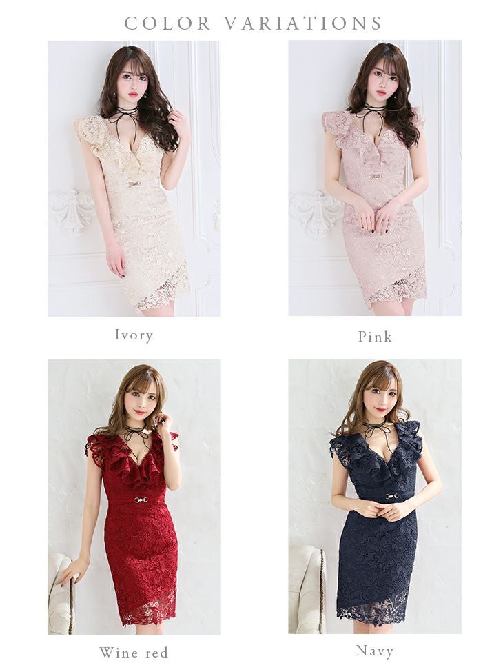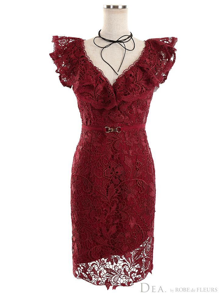 総レースで上品に女の子らしいミニドレス [DEA.byROBEdeFLEURS/ディアバイローブドフルール] 高級フリル袖 レーススリット チョーカー付き ワンカラー タイトミニドレス