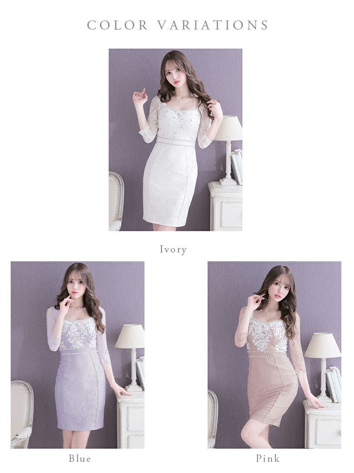 3. [DEA.byROBEdeFLEURS/ディアバイローブドフルール] 高級袖ありレースフラワー刺繍ビジュー膝丈タイトドレス