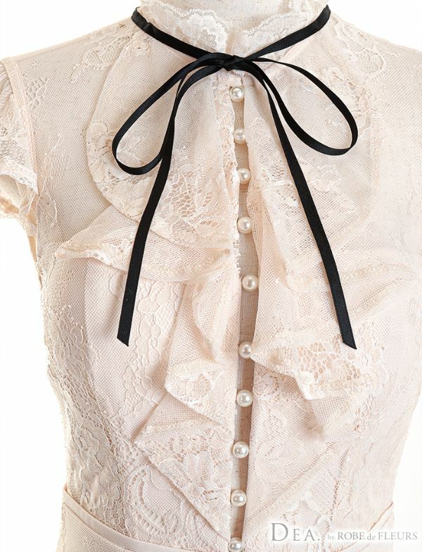 ガーリーな可愛さをプラス☆ [DEA.byROBEdeFLEURS/ディアバイローブドフルール] 高級ネックリボン胸元フリルオールレース半袖タイト膝丈ドレス