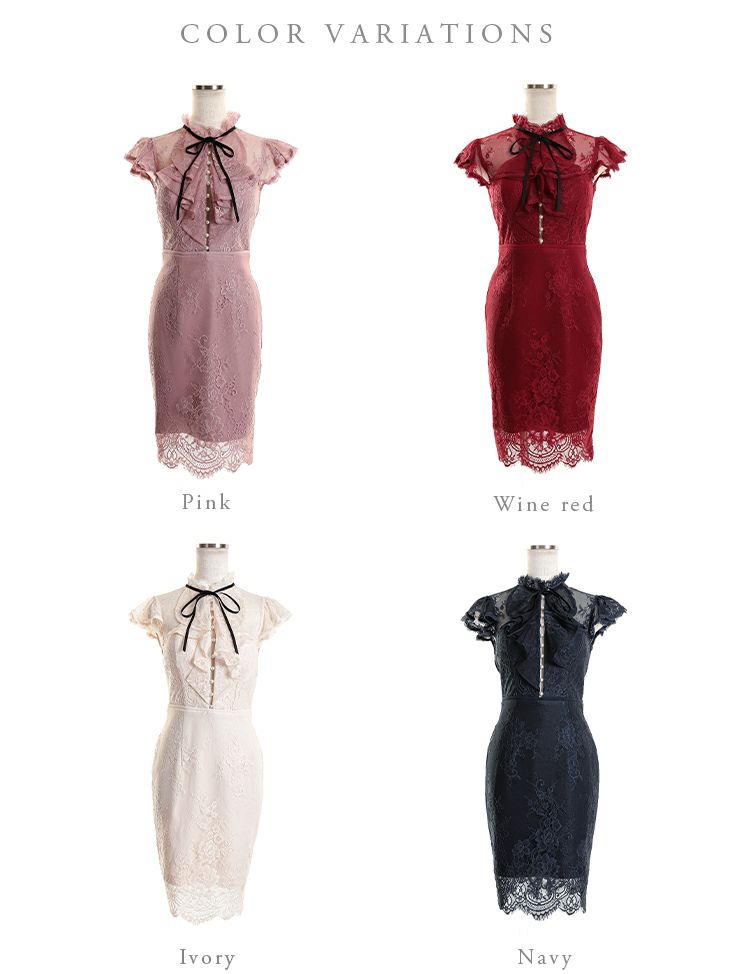 4. [DEA.byROBEdeFLEURS/ディアバイローブドフルール] 高級ネックリボン胸元フリルオールレース半袖タイト膝丈ドレス