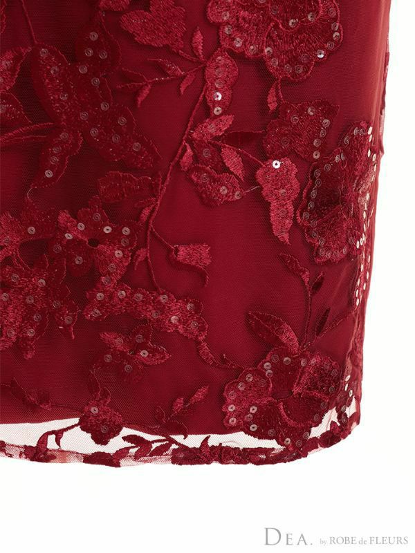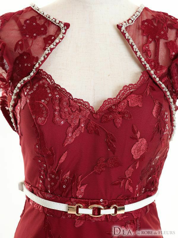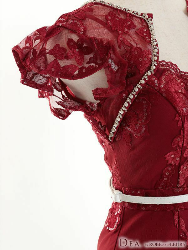 高級感溢れる上品な刺繍レース☆ SALE [DEA.byROBEdeFLEURS/ディアバイローブドフルール] 高級ベルト付きチュールフリル袖刺繍レースビジューノースリーブ膝丈タイトドレス