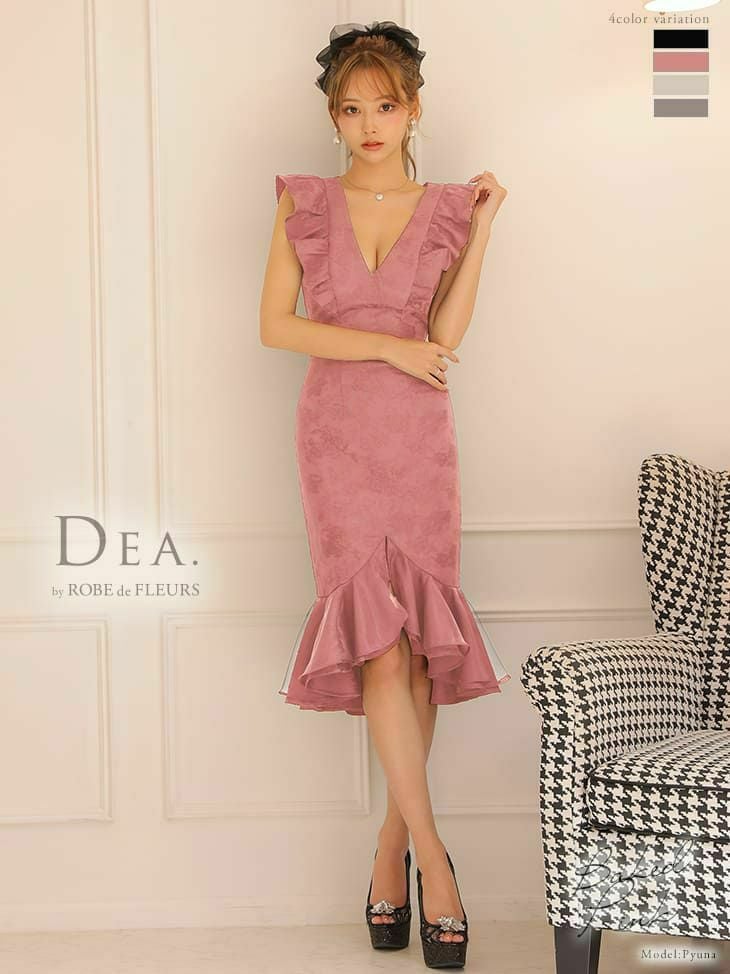 4. [DEA.byROBEdeFLEURS/ディアバイローブドフルール] 高級Vネックノースリーブフリルマーメイドワンピースジャガード膝丈ドレス