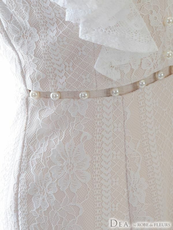 4. [DEA.byROBEdeFLEURS/ディアバイローブドフルール] 高級フリル袖ウエストパール総レース膝丈マーメイドワンピースノースリーブタイトドレス