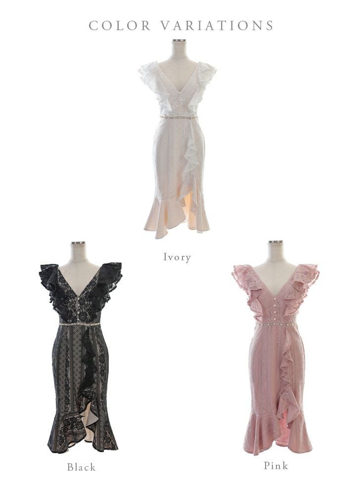 5. [DEA.byROBEdeFLEURS/ディアバイローブドフルール] 高級フリル袖ウエストパール総レース膝丈マーメイドワンピースノースリーブタイトドレス
