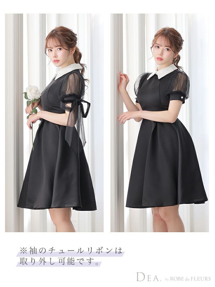 パーティードレスとしても着れる清潔感のあるデザインドレス☆ [DEA.byROBEdeFLEURS/ディアバイローブドフルール] 高級襟付きチュール半袖リボン膝丈Aラインワンピースドレス