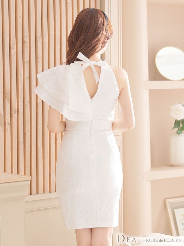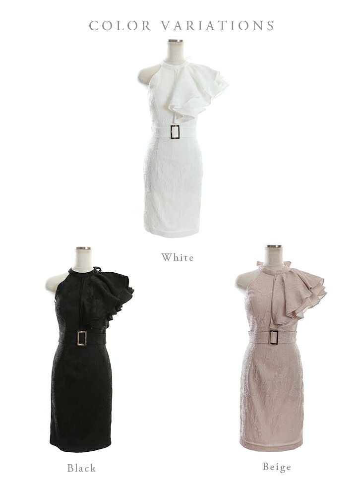 4. [DEA.byROBEdeFLEURS/ディアバイローブドフルール] 高級片サイドフリル袖ウエストベルト付きジャガード膝丈タイトドレス