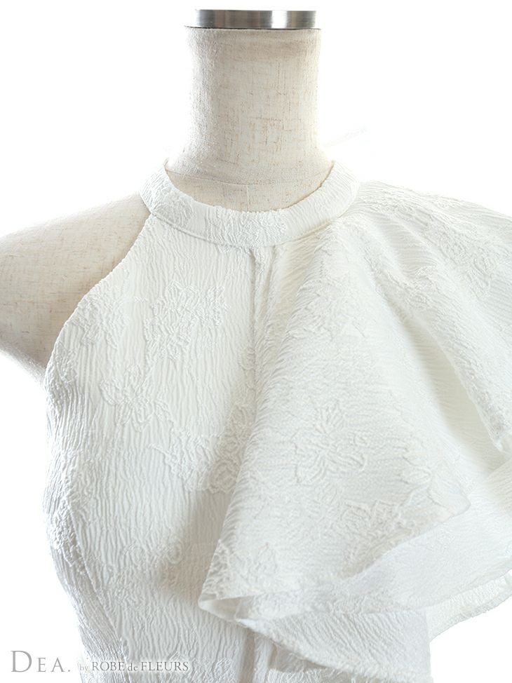 気になるバストラインも可愛くカバー☆ [DEA.byROBEdeFLEURS/ディアバイローブドフルール] 高級片サイドフリル袖ウエストベルト付きジャガード膝丈タイトドレス