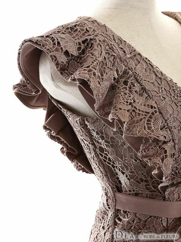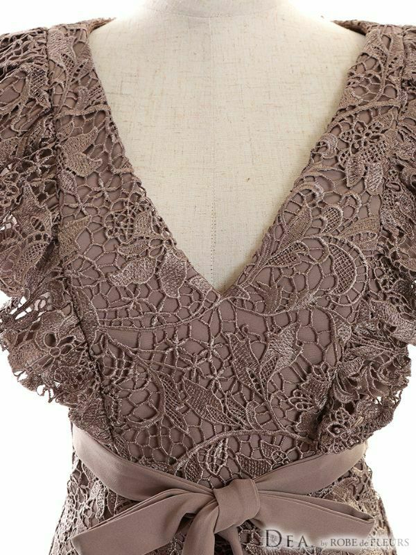 華やかで女性らしい上品なデザイン☆ [DEA.byROBEdeFLEURS/ディアバイローブドフルール] 高級Vネックフリル袖ケミカル総レースウエストリボンノースリーブ膝丈タイトドレス