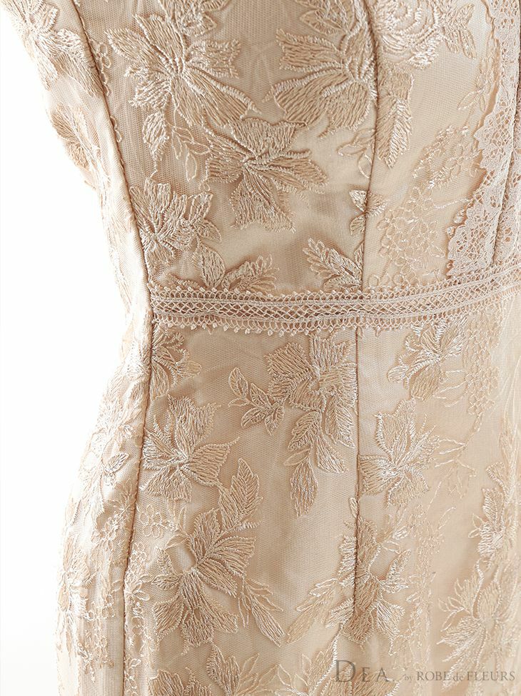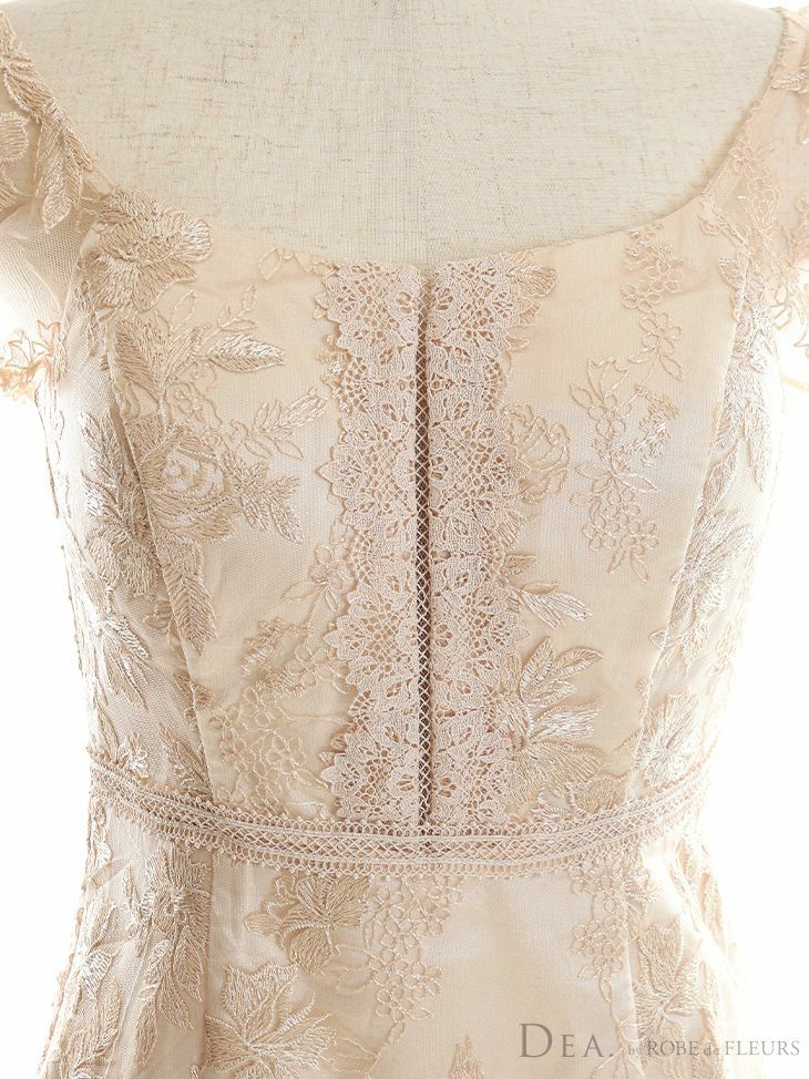 5. [DEA.byROBEdeFLEURS/ディアバイローブドフルール] 高級ノースリーブフラワー刺繍レースウエスト切替フリルスリーブタイト膝丈ドレス
