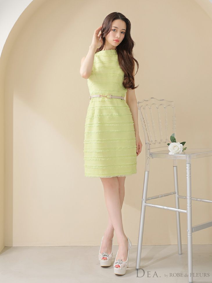 4. SALE [DEA.byROBEdeFLEURS/ディアバイローブドフルール] 高級フリンジ×ベルトシンプルノースリーブ膝丈タイトワンピースドレス