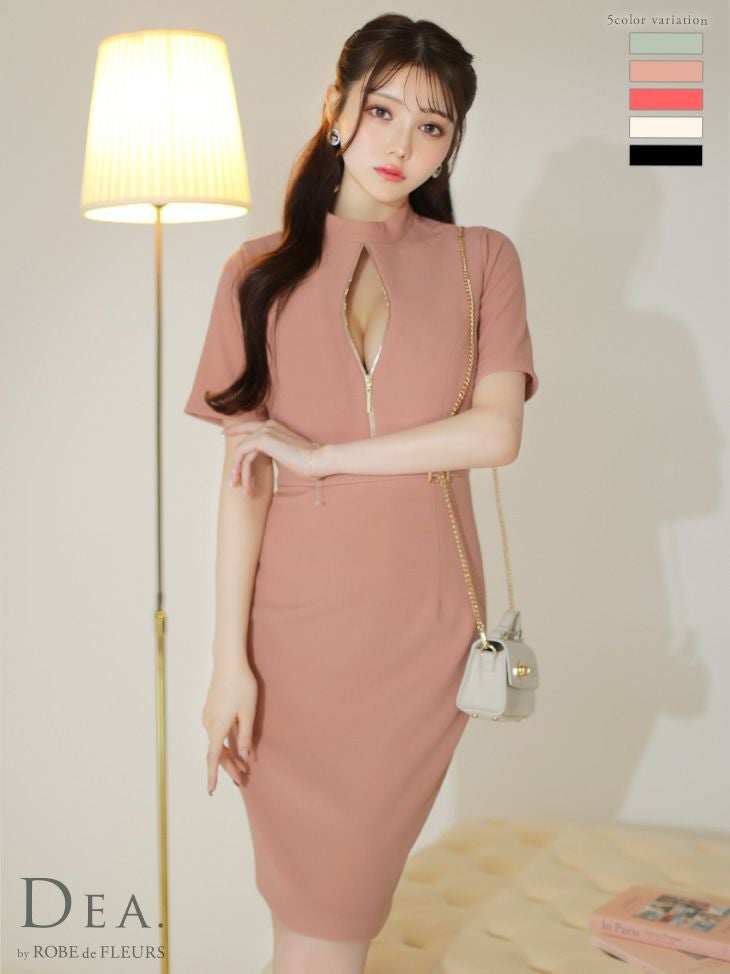 キャバドレス ミニドレス [DEA.byROBEdeFLEURS/ディアバイローブドフルール] 高級袖ありノースリーブバストジップウエストベルト付きワンカラータイト膝丈ドレス