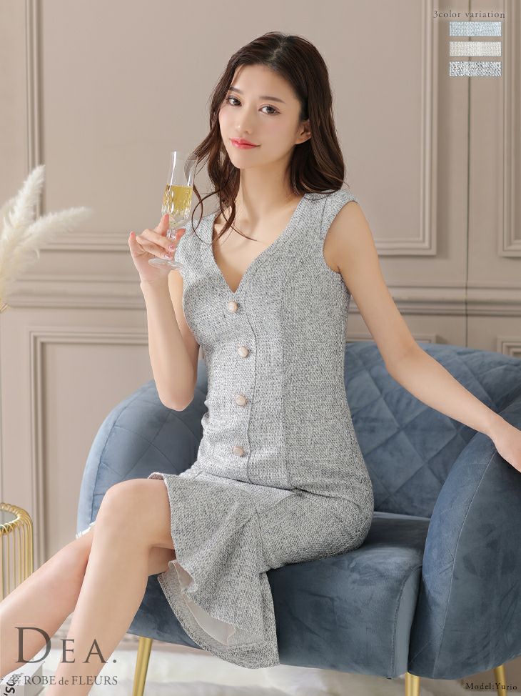 4. [DEA.byROBEdeFLEURS/ディアバイローブドフルール] 高級ラメツイードビジューボタンマーメイドノースリーブワンピース膝丈ドレス