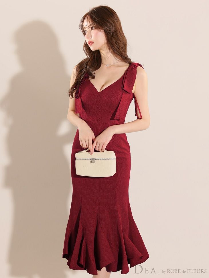 シルエットが綺麗なマーメードドレス♡ [DEA.byROBEdeFLEURS/ディアバイローブドフルール] 高級ワンカラーショルダーリボンマーメイドフリルノースリーブワンピースタイト膝丈ドレス