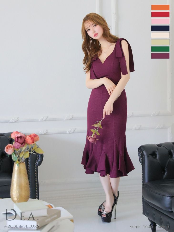 人気ドレスから新色登場♡ [DEA.byROBEdeFLEURS/ディアバイローブドフルール] 高級ワンカラーショルダーリボンマーメイドフリルノースリーブワンピースタイト膝丈ドレス