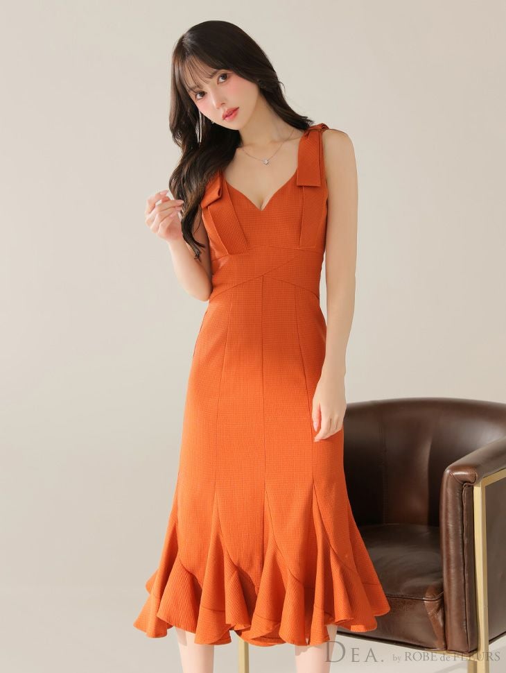 5. [DEA.byROBEdeFLEURS/ディアバイローブドフルール] 高級ワンカラーショルダーリボンマーメイドフリルノースリーブワンピースタイト膝丈ドレス