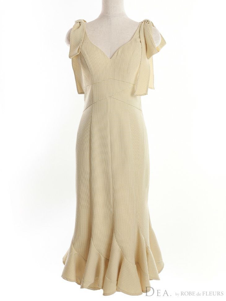 4. [DEA.byROBEdeFLEURS/ディアバイローブドフルール] 高級ワンカラーショルダーリボンマーメイドフリルノースリーブワンピースタイト膝丈ドレス