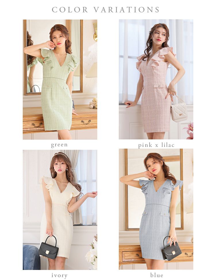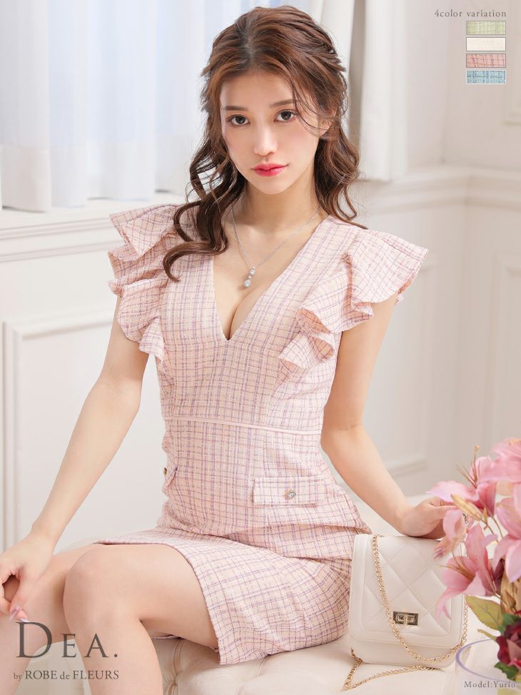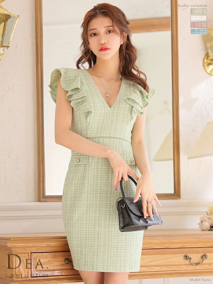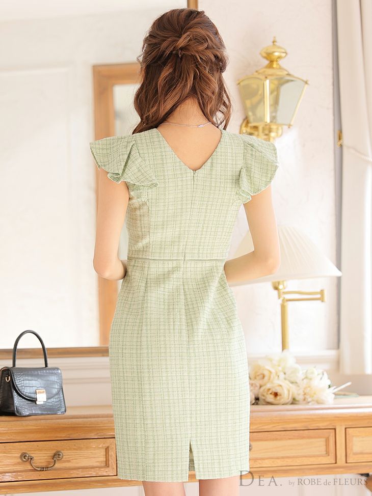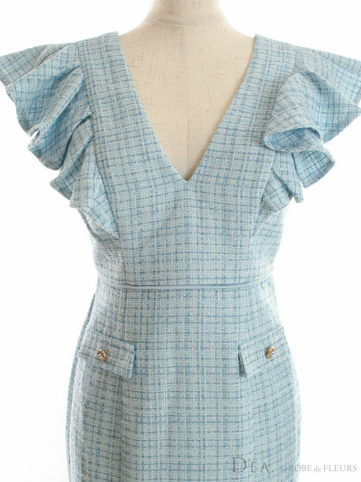 高級感が溢れる上品なタイトドレス♡ SALE [DEA.byROBEdeFLEURS/ディアバイローブドフルール] 高級フリル袖Vネックツイードウエスト切替ノースリーブタイトワンピース膝丈ドレス