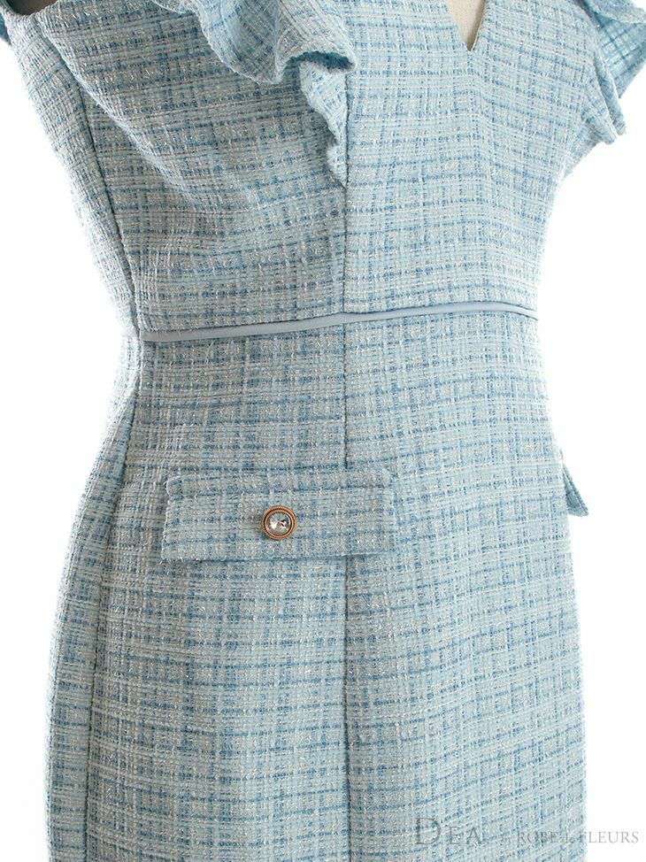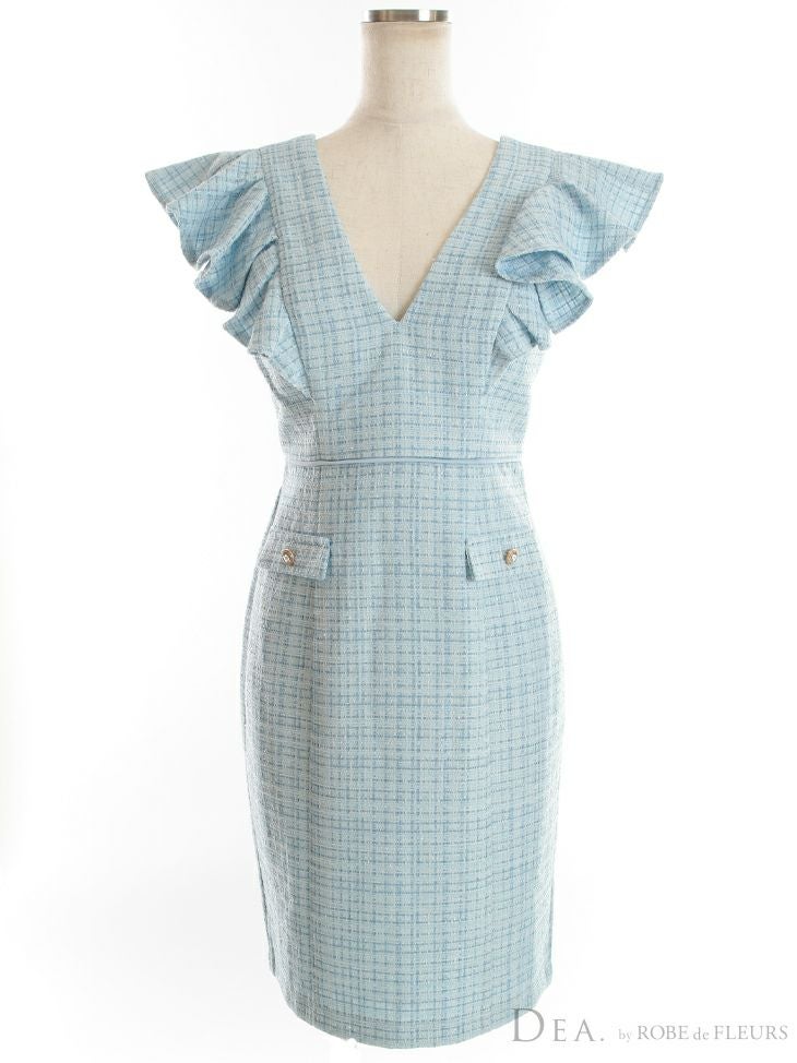 5. SALE [DEA.byROBEdeFLEURS/ディアバイローブドフルール] 高級フリル袖Vネックツイードウエスト切替ノースリーブタイトワンピース膝丈ドレス