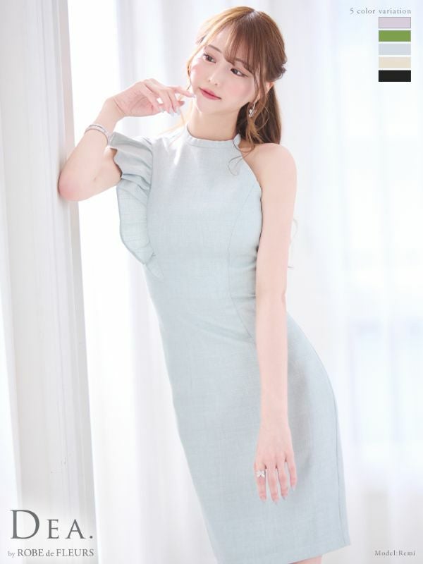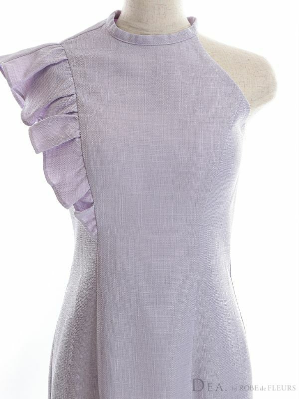 5. [DEA.byROBEdeFLEURS/ディアバイローブドフルール] 高級ワンカラーツイードショルダーフリルアシンメトリーノースリーブタイト膝丈ドレス
