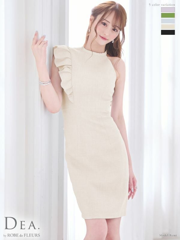 4. [DEA.byROBEdeFLEURS/ディアバイローブドフルール] 高級ワンカラーツイードショルダーフリルアシンメトリーノースリーブタイト膝丈ドレス