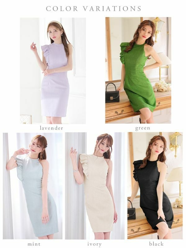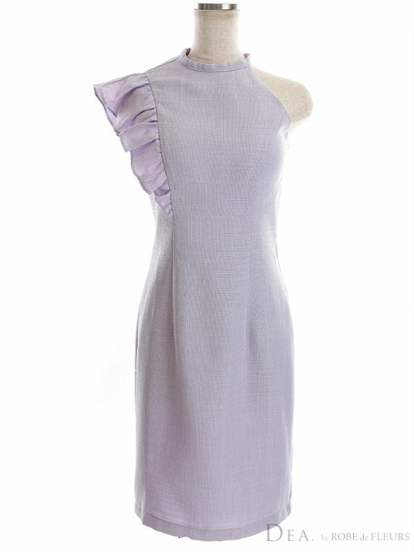 同伴などにも着れちゃう上品ドレス☆ [DEA.byROBEdeFLEURS/ディアバイローブドフルール] 高級ワンカラーツイードショルダーフリルアシンメトリーノースリーブタイト膝丈ドレス