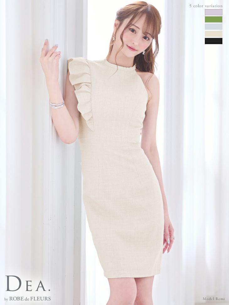 5. [DEA.byROBEdeFLEURS/ディアバイローブドフルール] 高級ワンカラーツイードショルダーフリルアシンメトリーノースリーブタイト膝丈ドレス