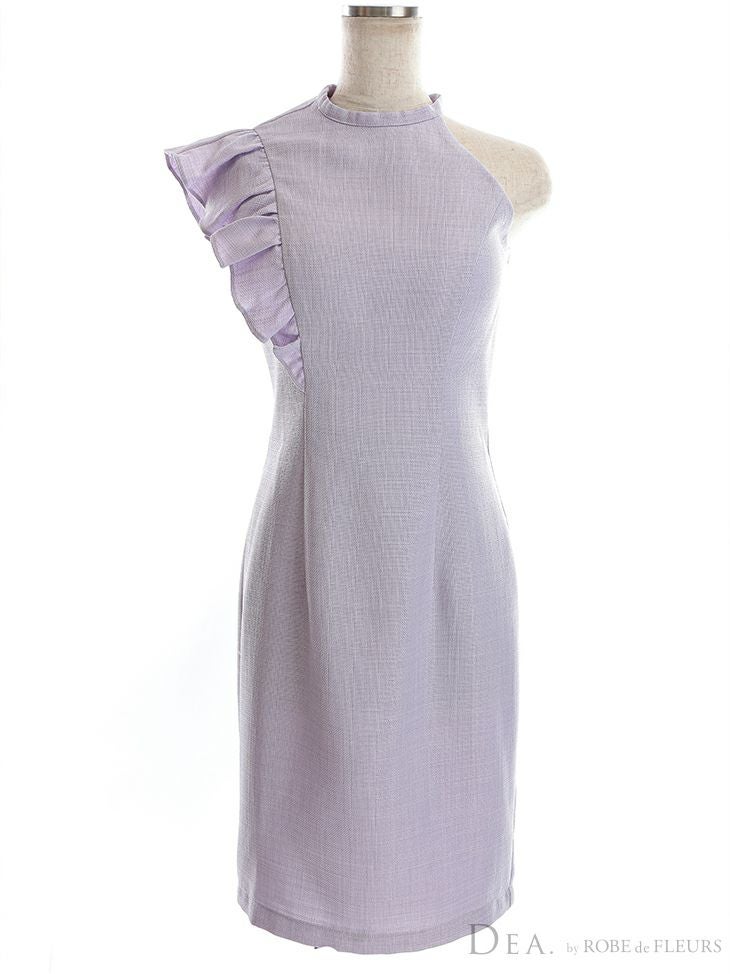 スプリングツイードとフリルで上品☆ [DEA.byROBEdeFLEURS/ディアバイローブドフルール] 高級ワンカラーツイードショルダーフリルアシンメトリーノースリーブタイト膝丈ドレス