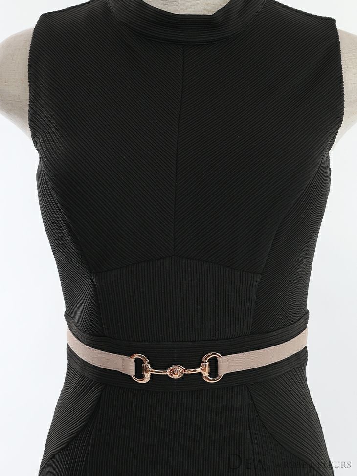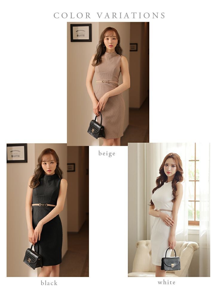 5. SALE [DEA.byROBEdeFLEURS/ディアバイローブドフルール] 高級ウエストベルト付きハイネックワンカラーノースリーブタイト膝丈ワンピースドレス