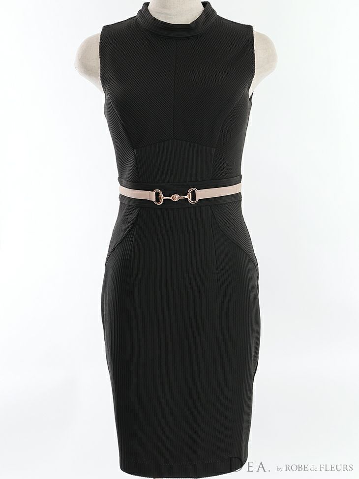 ベルトライクなデザインが特徴☆ SALE [DEA.byROBEdeFLEURS/ディアバイローブドフルール] 高級ウエストベルト付きハイネックワンカラーノースリーブタイト膝丈ワンピースドレス