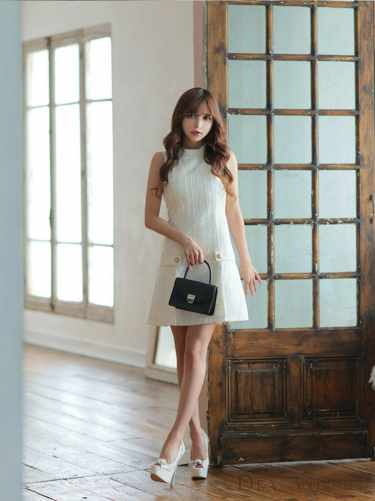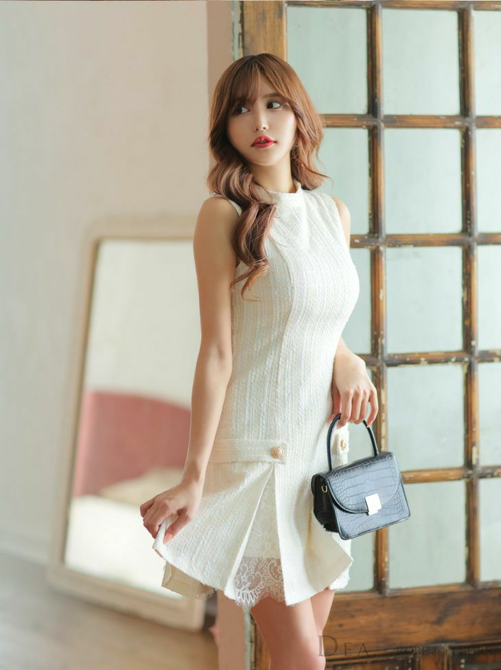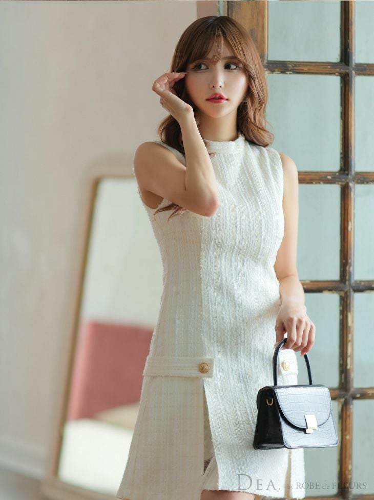 4. [DEA.byROBEdeFLEURS/ディアバイローブドフルール] 高級ラメツイードレースプリーツノースリーブワンピースタイトミニドレス