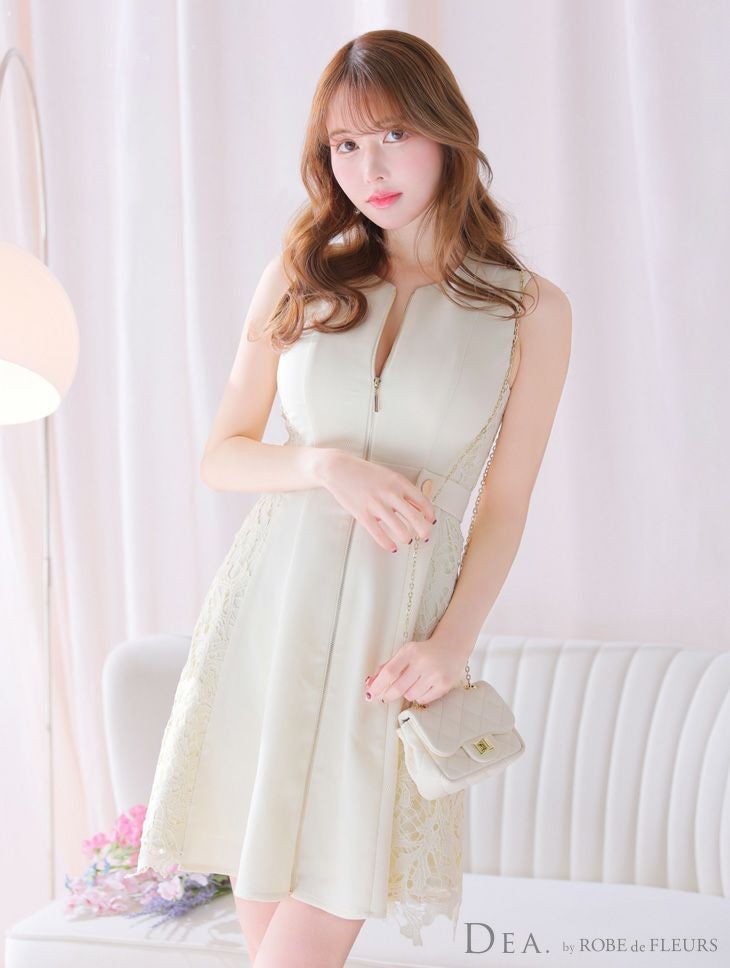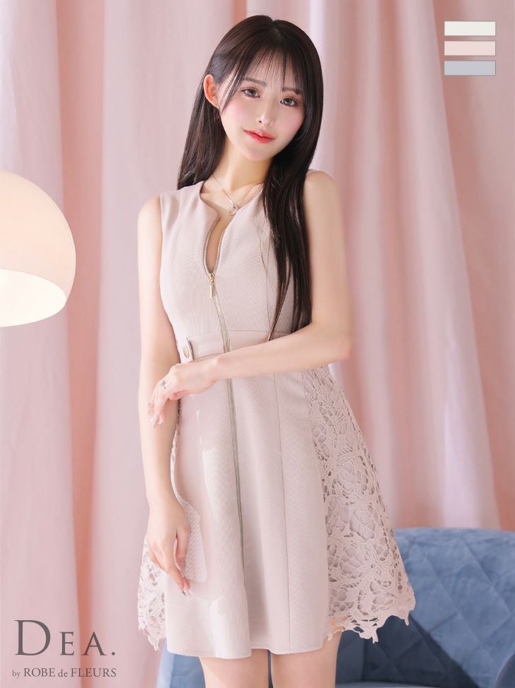 キャバドレス ジップ DEA.byROBEdeFLEURS ディアバイローブドフルール 高級ジップウエストベルトノースリーブサイドレースワンカラーフレアミニドレス
