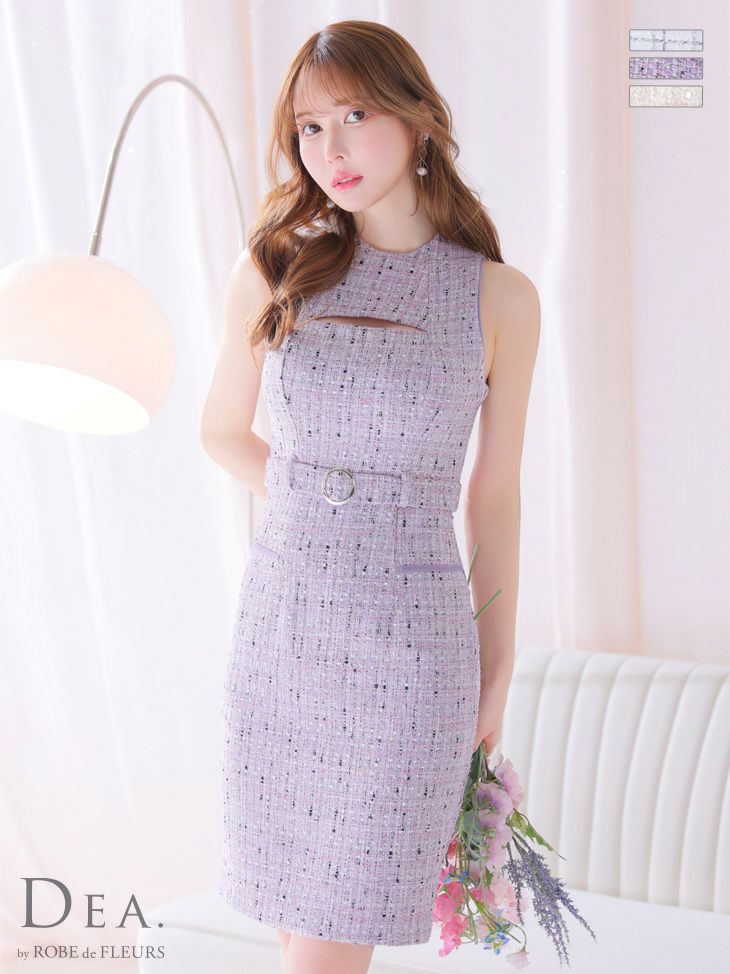 キャバドレス ブランド DEA.byROBEdeFLEURS ディアバイローブドフルール 高級ツイードバストカットウエストベルトノースリーブタイト膝丈ドレス