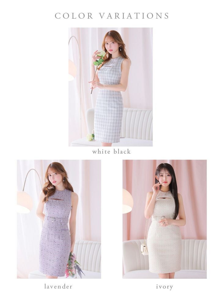 バストカットで上品に肌見せ☆ [DEA.byROBEdeFLEURS/ディアバイローブドフルール] 高級 ツイード バストカット ウエストベルト ノースリーブ タイト 谷間魅せ 膝丈ドレス