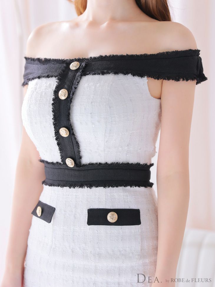 キャバドレス ツイード DEA.byROBEdeFLEURS ディアバイローブドフルール 高級スプリングツイードボタン切り替えオフショルダータイトミニドレス