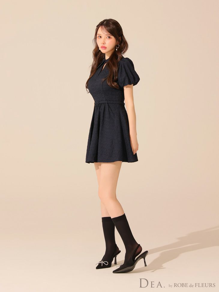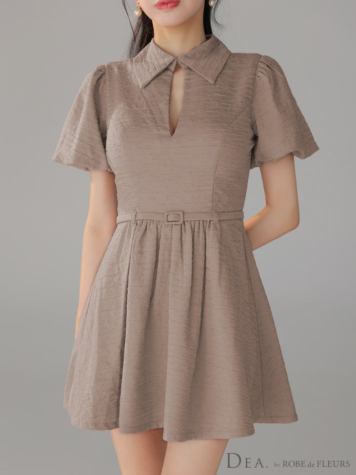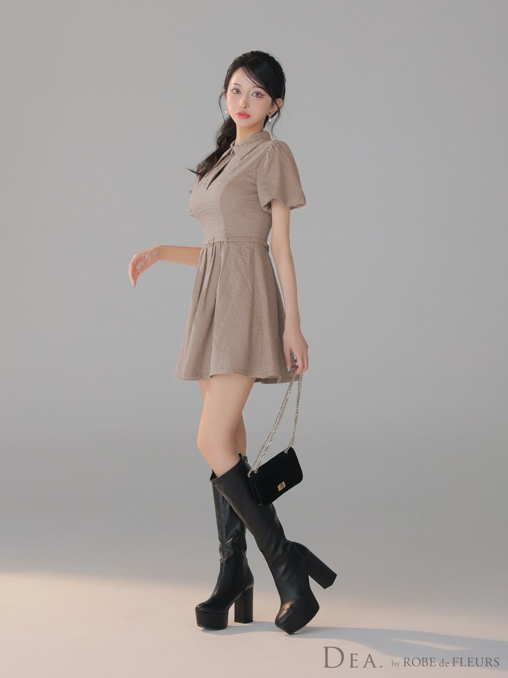 襟付きで上品な印象に♡ [DEA.byROBEdeFLEURS/ディアバイローブドフルール] 高級 ブランド Aラインミニドレス 谷間 半袖 ウエストベルト 襟付き ワンカラー ワッフル