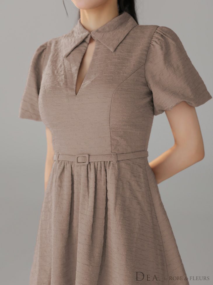 6. [DEA.byROBEdeFLEURS/ディアバイローブドフルール] 高級 ブランド Aラインミニドレス 谷間 半袖 ウエストベルト 襟付き ワンカラー ワッフル