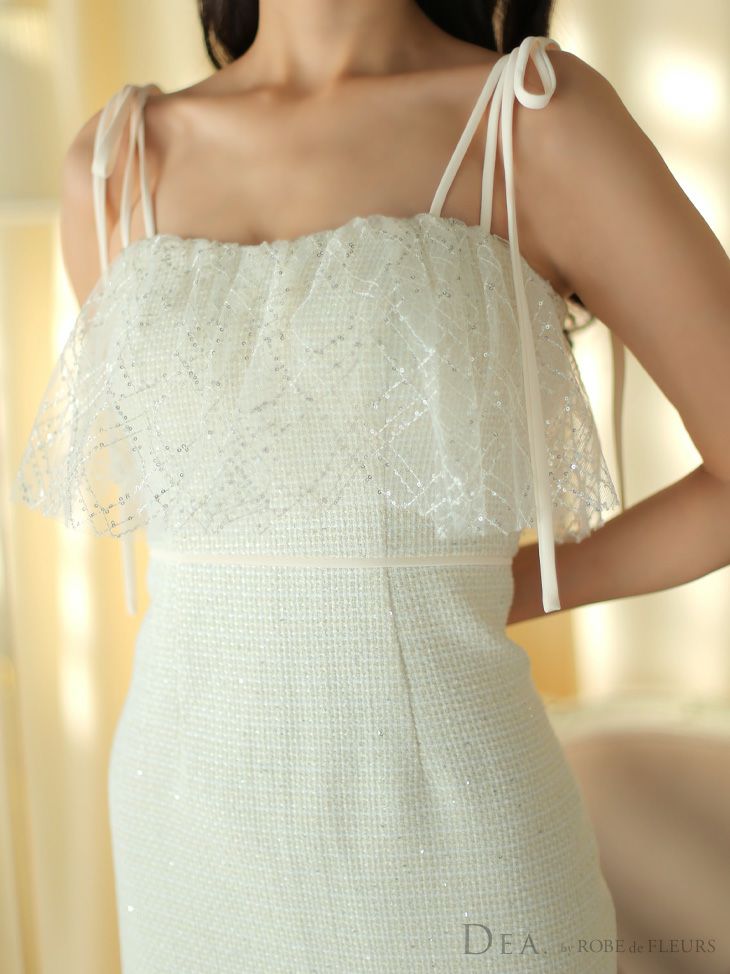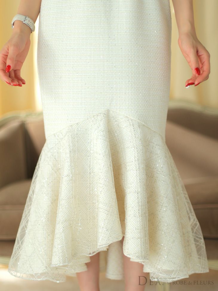 他の画像を見る バストをあまり強調したくない方にもオススメ! [DEA.byROBEdeFLEURS/ディアバイローブドフルール] 高級 スプリングツイード キャミソール リボン ワンカラ ーマーメイド ロングテール フレア 膝丈ドレス ¥ 32,780 税込 在庫切れ お気に入りに追加