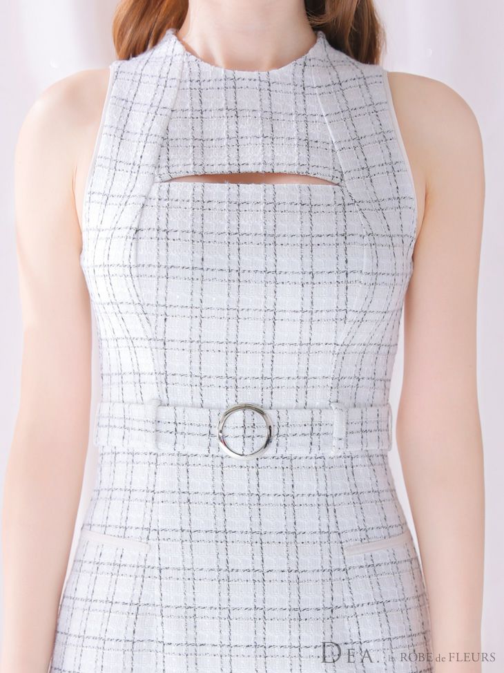 他の画像を見る バストカットで上品に肌見せ☆ [DEA.byROBEdeFLEURS/ディアバイローブドフルール] 高級 ツイード バストカット ウエストベルト ノースリーブ タイト 谷間魅せ 膝丈ドレス ¥ 30,580 税込 在庫切れ お気に入りに追加