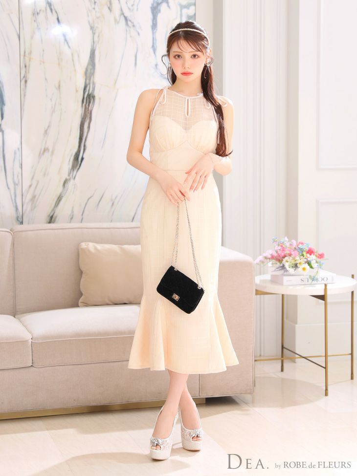他の画像を見る マーメイドでボディーラインを強調しスタイルアップ☆ [DEA.byROBEdeFLEURS/ディアバイローブドフルール] 高級シースルーネックリボンワンカラーチェック柄ノースリーブフレアマーメイドロングドレス ¥ 32,780 税込 在庫切れ お気に入りに追加