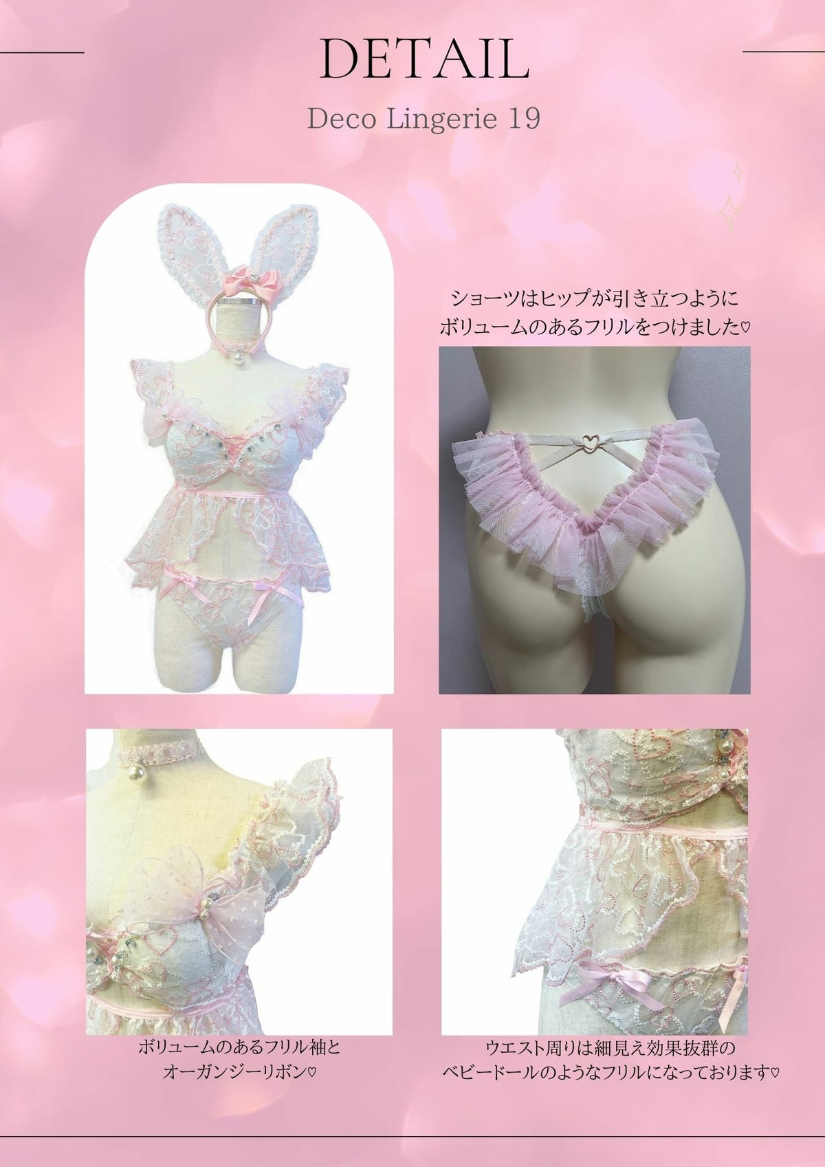 他の画像を見る イベント撮影にもぴったり☆ [DecoLingerie/デコランジェリー] [勝負下着] 高級ハート柄刺繍チュールフリルリボンバニーガーリーランジェリー5点セット[ブラジャー/Tバックショーツ/カチューシャ/チョーカー/ウエストフリル] ¥ 25,080 税込 お気に入りに追加