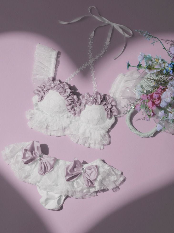 甘さ引き立つキュートな水着☆ [DecoLingerie/デコランジェリー] [水着] 高級 刺繍レース リボン フリル スパンコールレース キュート ビキニ 上下セット[ビキニ/フリルショーツ]