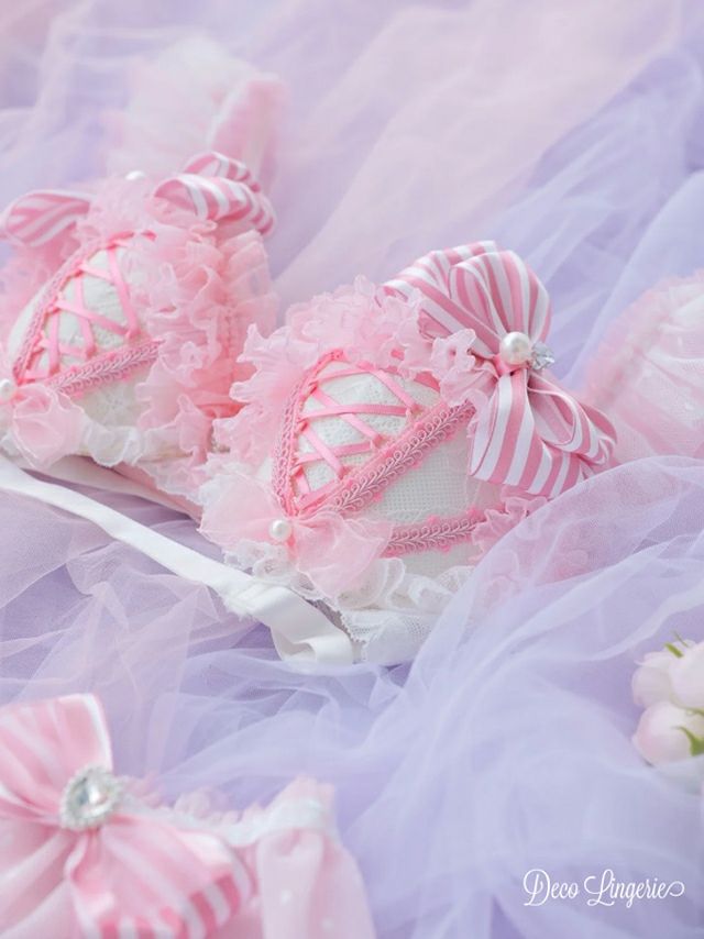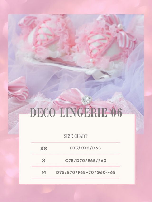 3. [DecoLingerie/デコランジェリー] [勝負下着] 高級ストライプリボンフリルキュートランジェリー4点セット[ブラジャー/Tバックショーツ/チョーカー/ウエストフリル]