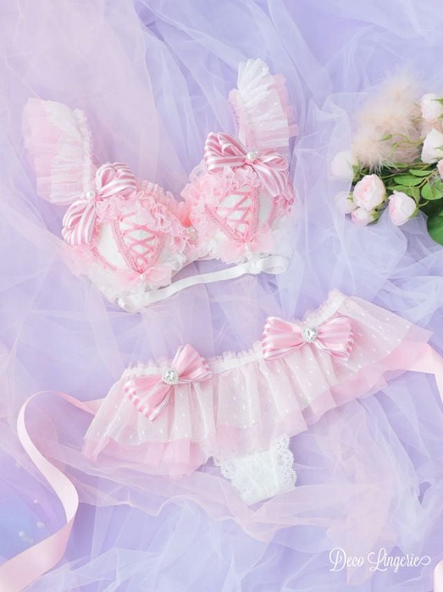 4. [DecoLingerie/デコランジェリー] [勝負下着] 高級ストライプリボンフリルキュートランジェリー4点セット[ブラジャー/Tバックショーツ/チョーカー/ウエストフリル]