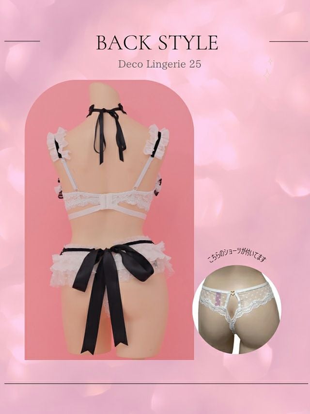 3. [DecoLingerie/デコランジェリー] [勝負下着] 高級ドットリボンチュールフリルモノクロランジェリー5点セット[ブラジャー/Tバックショーツ/チョーカー/カフス/ウエストフリル]