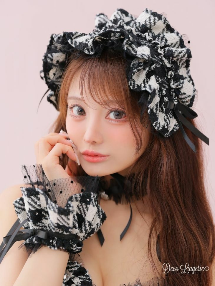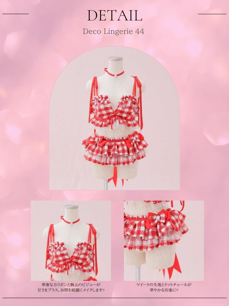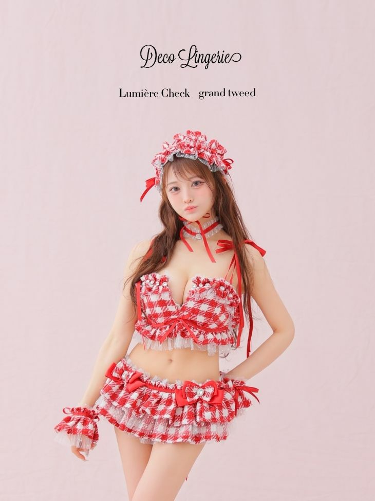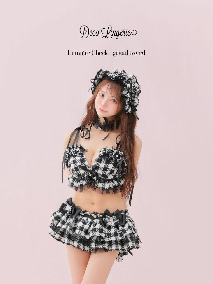 女の子の可愛さをたくさん詰め込んだデザイン♡ [DecoLingerie/デコランジェリー] [勝負下着] 高級 ブランド ツイード ギンガムチェック ラメ サテンリボン フリル ガーリー 6点セット[ブラ/Tバックショーツ/チョーカー/ウエストフリル/ヘッドドレス/カフス]