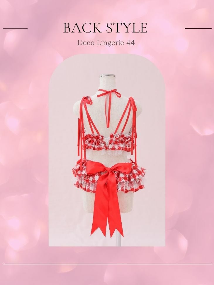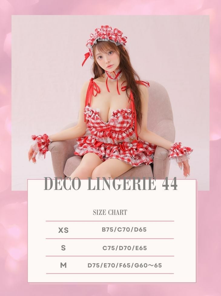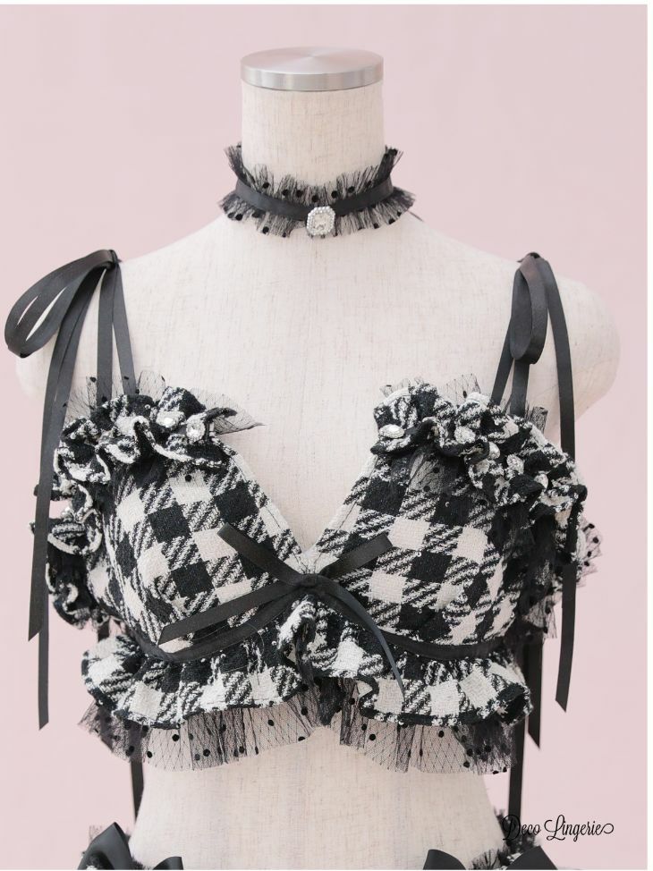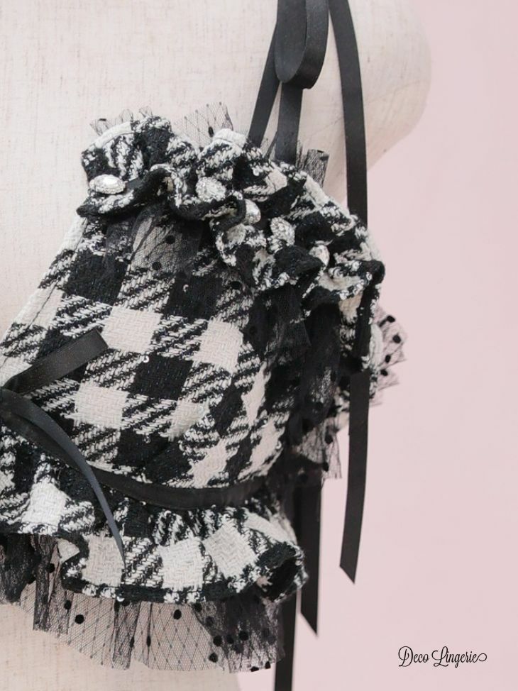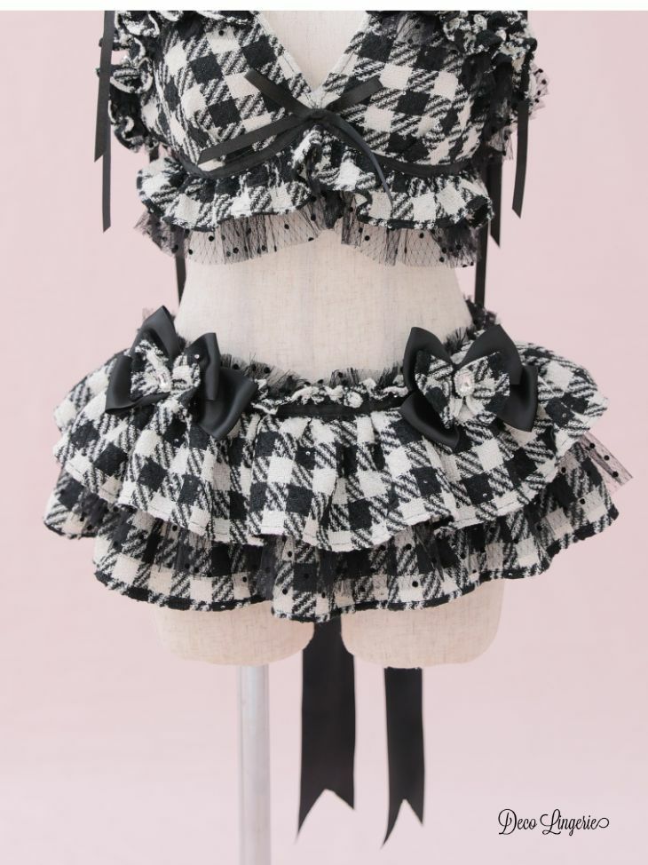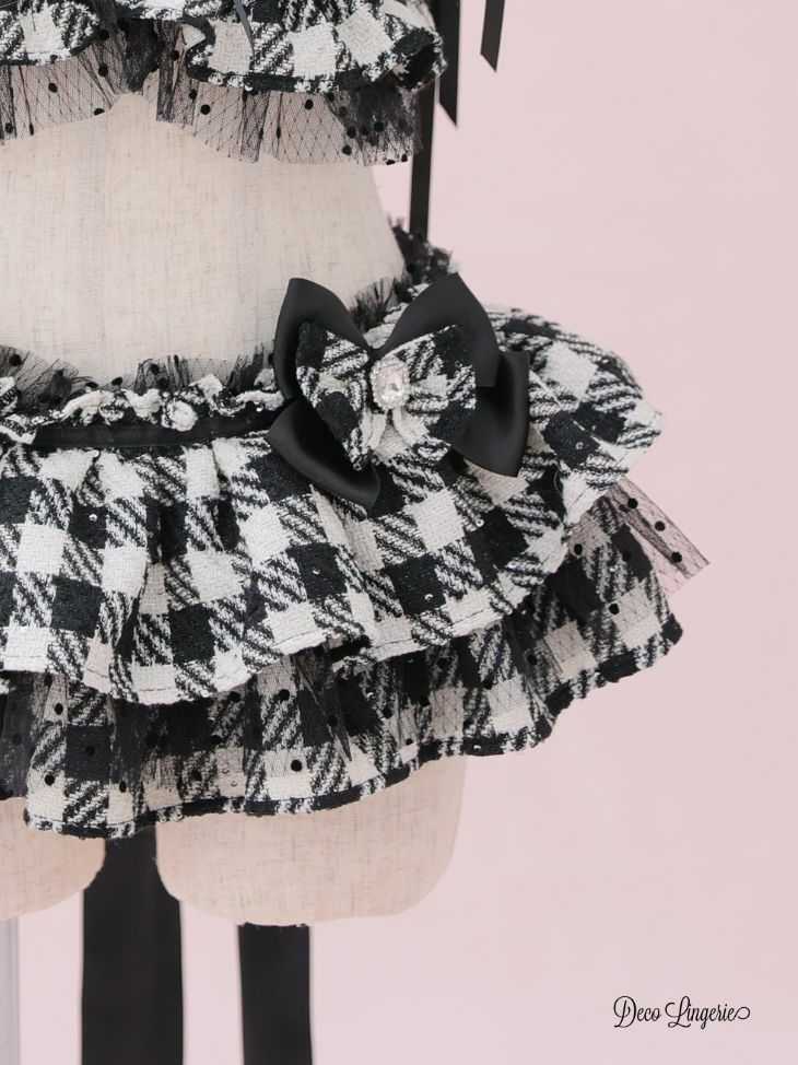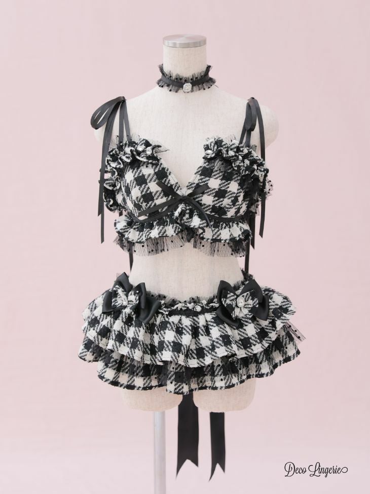 3. [DecoLingerie/デコランジェリー] [勝負下着] 高級 ブランド ツイード ギンガムチェック ラメ サテンリボン フリル ガーリー 6点セット[ブラ/Tバックショーツ/チョーカー/ウエストフリル/ヘッドドレス/カフス]