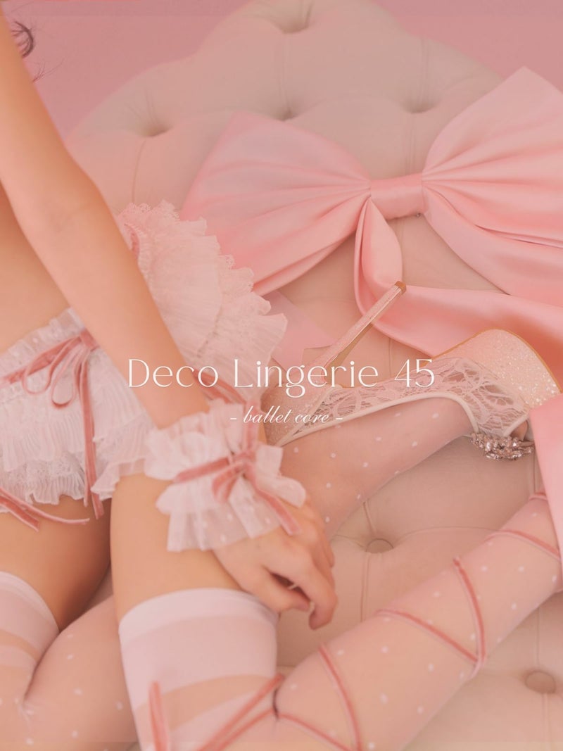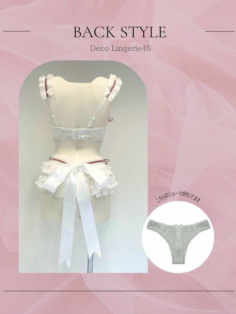 甘さを注ぎ込んだキュートなデザイン☆ [DecoLingerie/デコランジェリー] [勝負下着] 高級 ベルベットリボン チュールフリル ビジュー ガーリー ランジェリー 4点セット[ブラ/Tバックショーツ/ウエストフリル/カフス]