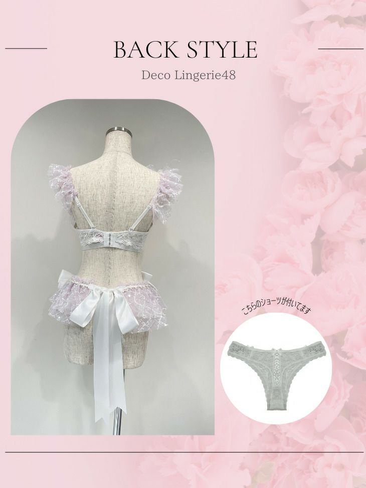 3. [DecoLingerie/デコランジェリー] [勝負下着] 高級 スパンコールレース ラメチュール クリスタルフラワー リボン フェミニン ランジェリー 4点セット[ブラ/Tバックショーツ/ウエストフリル/チョーカー(金属)]