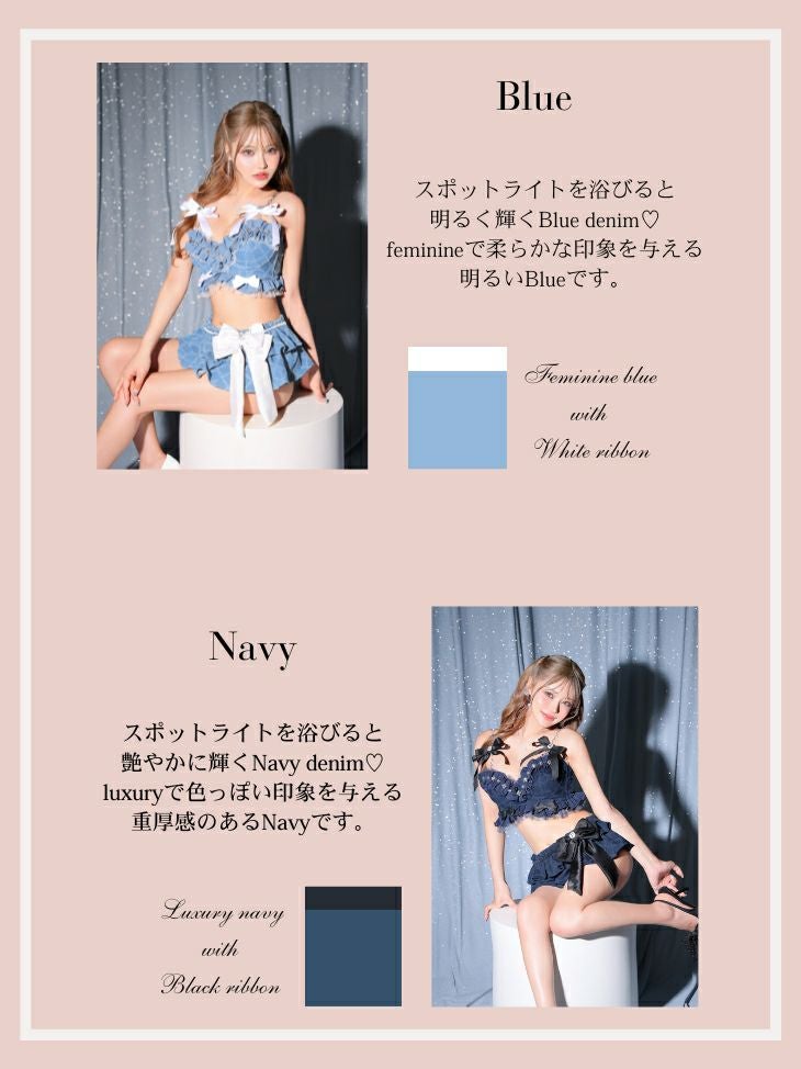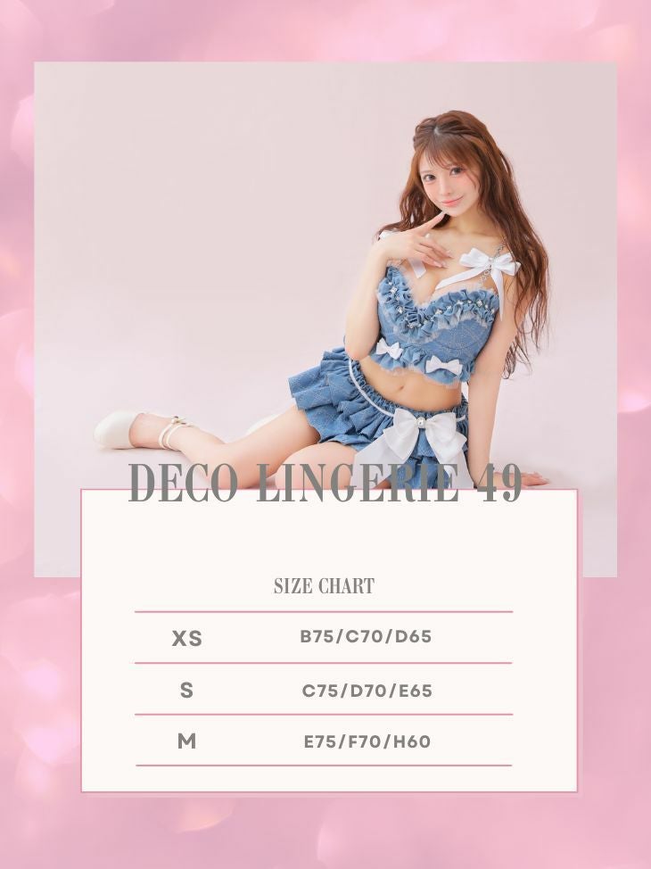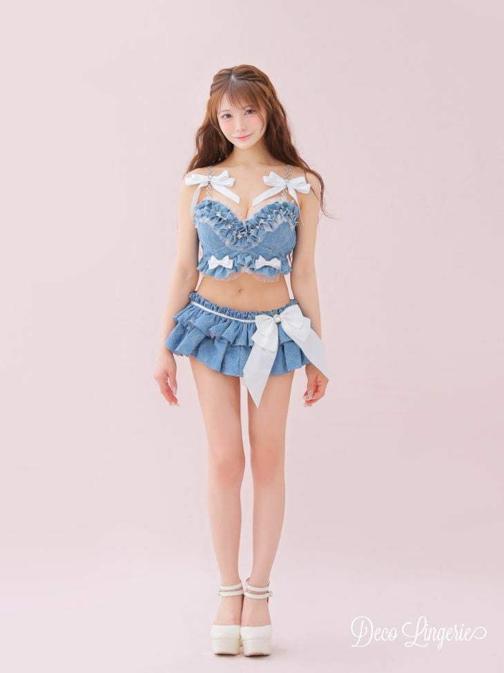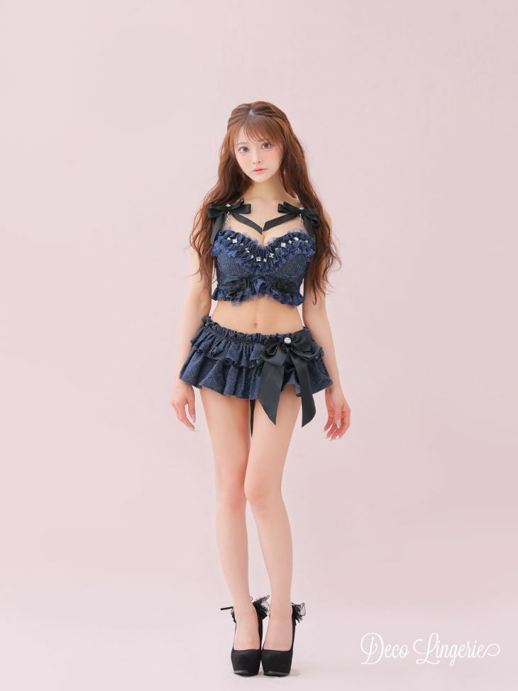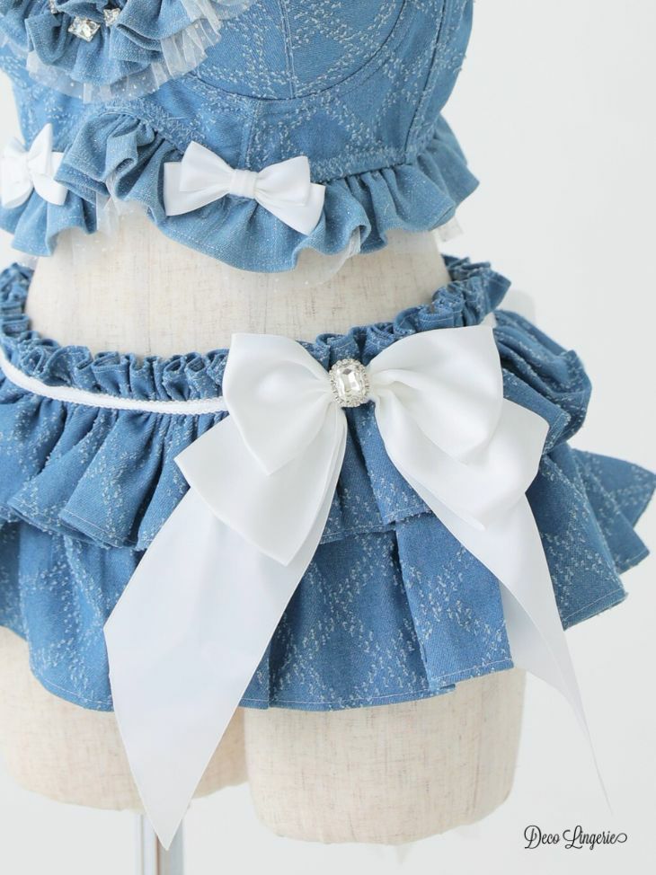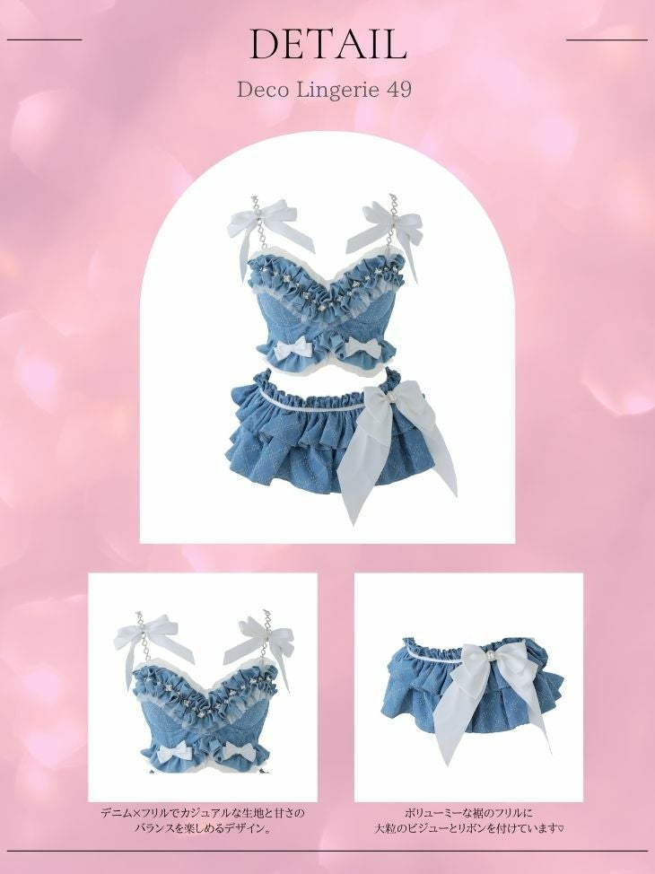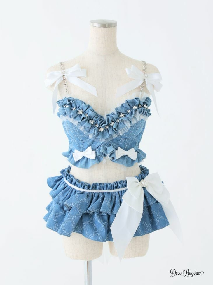 カジュアルなデニム素材でフェミニンに♡ [DecoLingerie/デコランジェリー] [勝負下着] 高級 ブランド デニム ショルダーチェーン ラメ チュール フェミニン リボン フリル ビジュー 3点セット[ブラ/Tバックショーツ/ウエストフリル]
