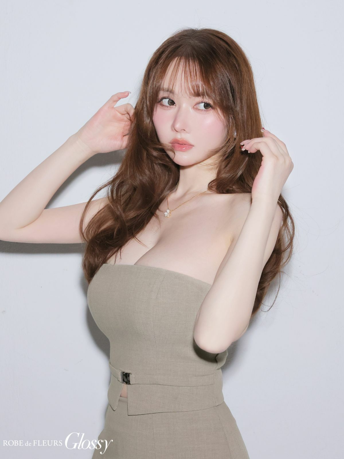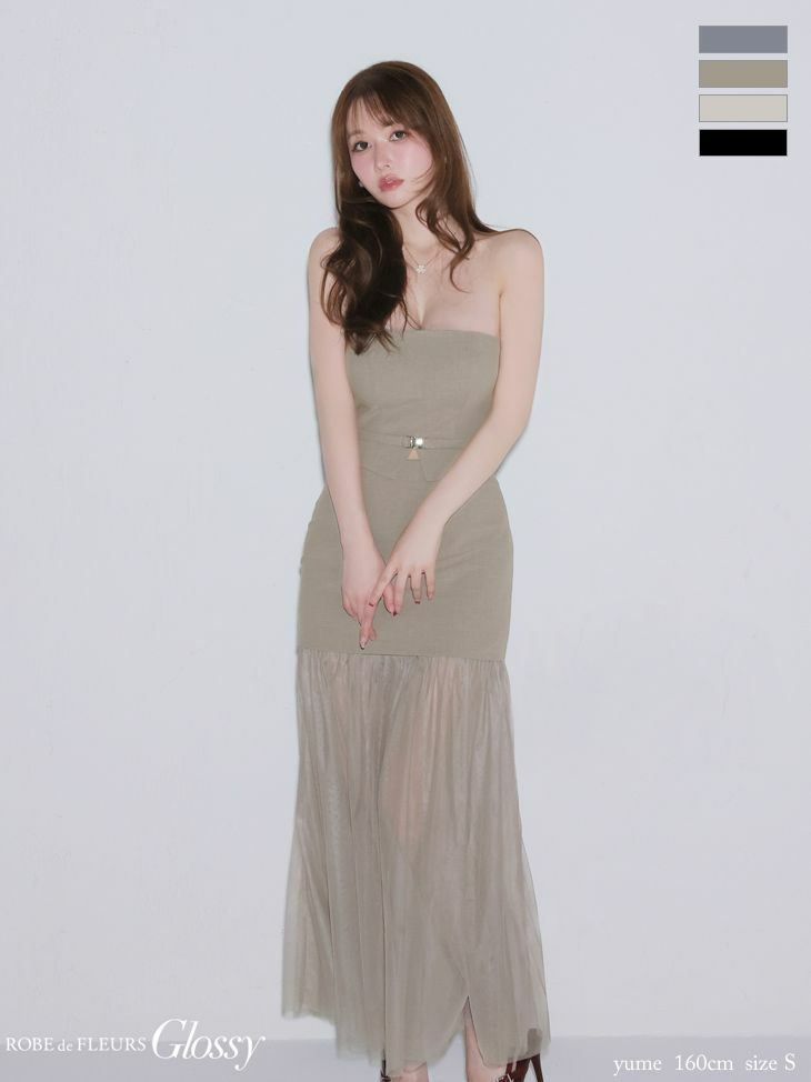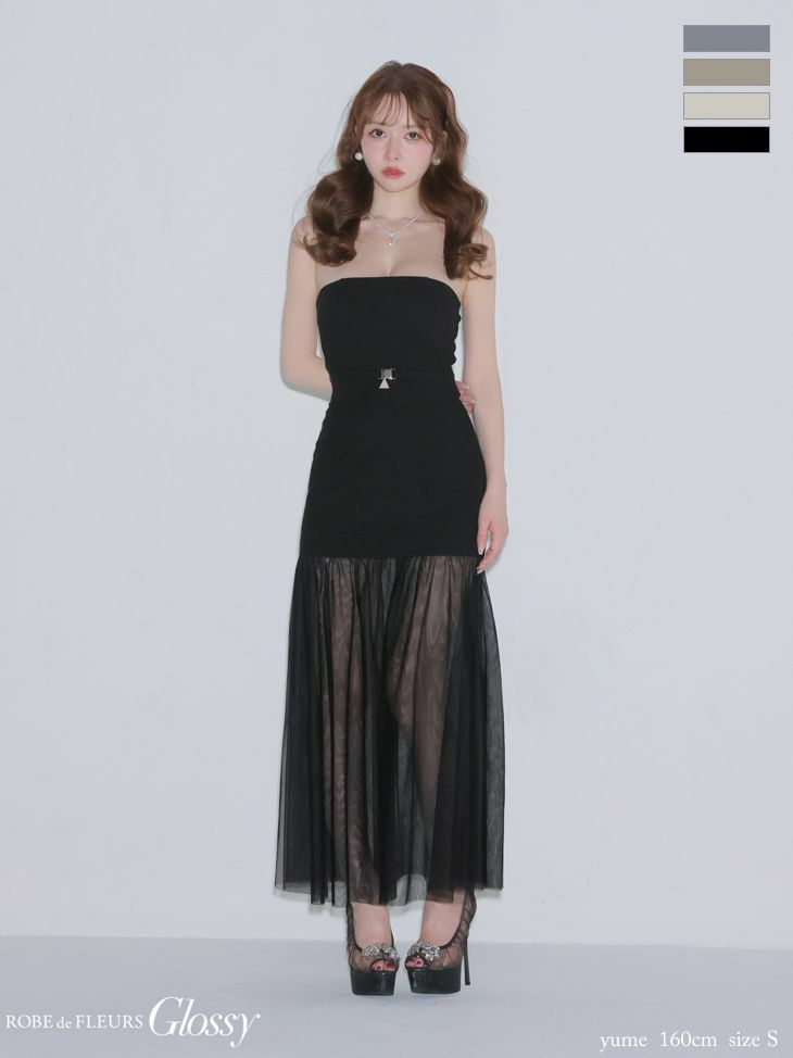 4. [ROBEdeFLEURSGlossy/ローブドフルールグロッシー] 高級 ブランド Aラインロングドレス 谷間 ベア セットアップ チュール切替 ウエストベルト ワンカラー